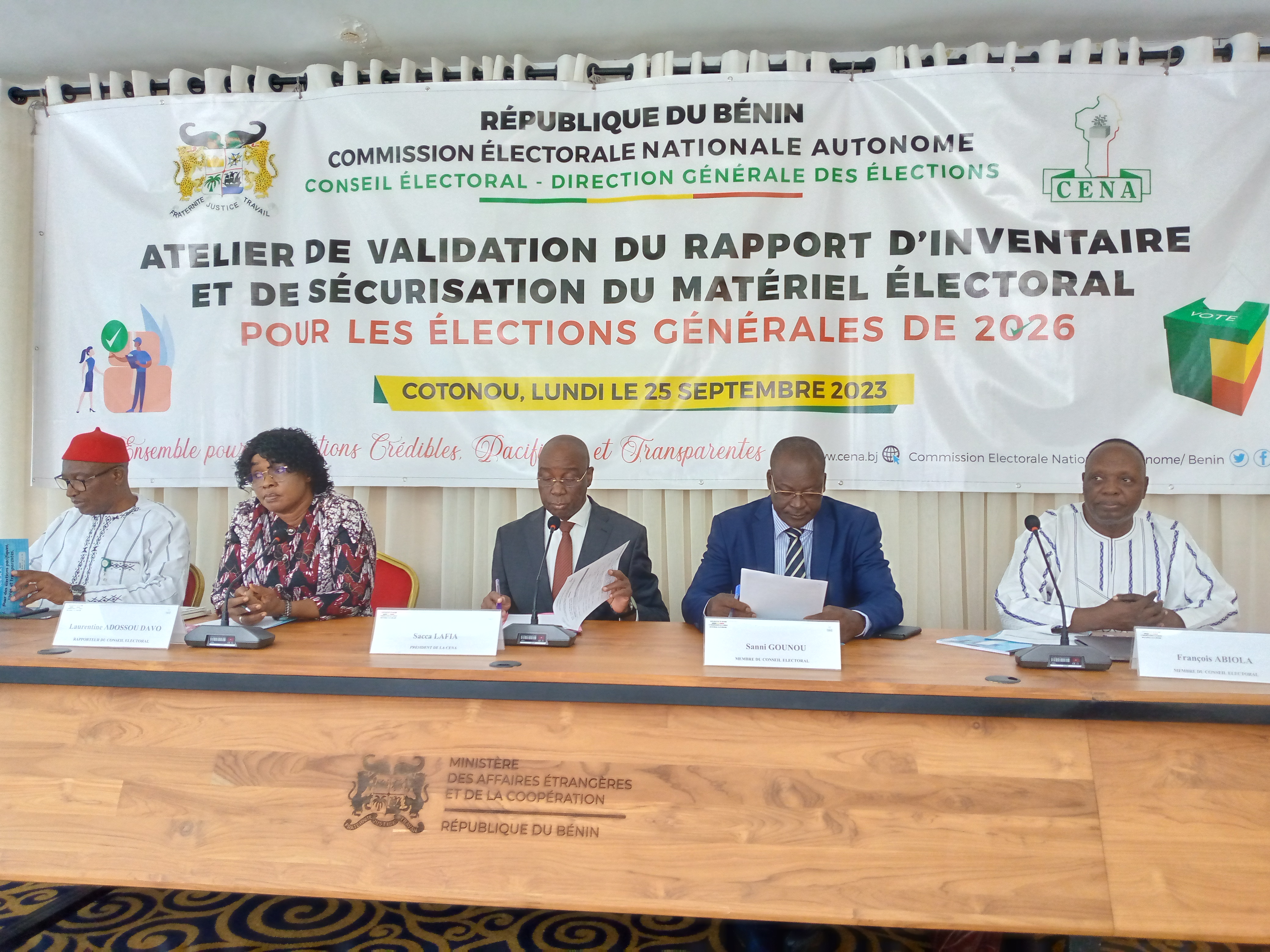 La salle fleuve Jaune du ministère des affaires étrangères abrite depuis ce lundi 25 septembre 2023, un atelier de validation du rapport d’inventaire et de sécurisation du matériel électoral pour les élections générales de 2026. A l’ouverture, Sacca Lafia, président de la Commission électorale nationale autonome (Céna) a, en présence des représentants des partis politiques, des organisations de la société civile et autres, indiqué que l’objectif, est de présenter pour validation le point du matériel, mais aussi d’échanger et d’opiner sur les quantités qui seront utilisées pour l’organisation des scrutins à venir.