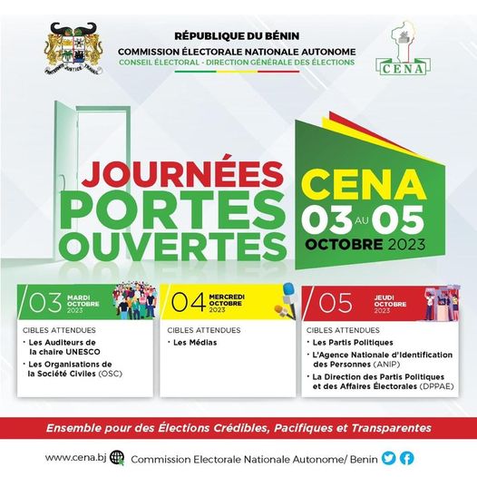 Avis au public béninois ! La Commission électorale nationale autonome (Céna) ouvre ses portes à compter de ce mardi. En effet, l’institution que préside Sacca Lafia organise des journées portes ouvertes du mardi 3 au jeudi 5 octobre 2023.