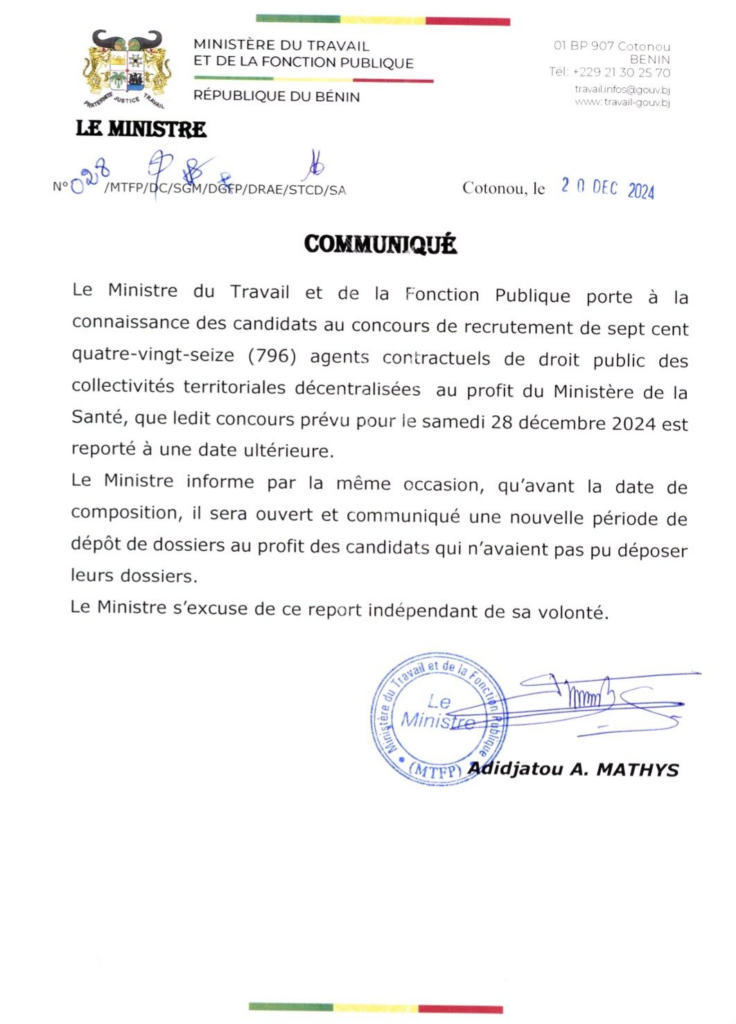 « Le ministre du Travail et de la fonction publique porte à la connaissance des candidats au concours de recrutement de 796 Agents Contractuels de Droit Public des Collectivités territoriales décentralisées au profit du Ministère de la Santé, que ledit concours prévu pour le samedi 28 décembre 2024 est reporté à une date ultérieure », peut-on lire dans le communiqué.