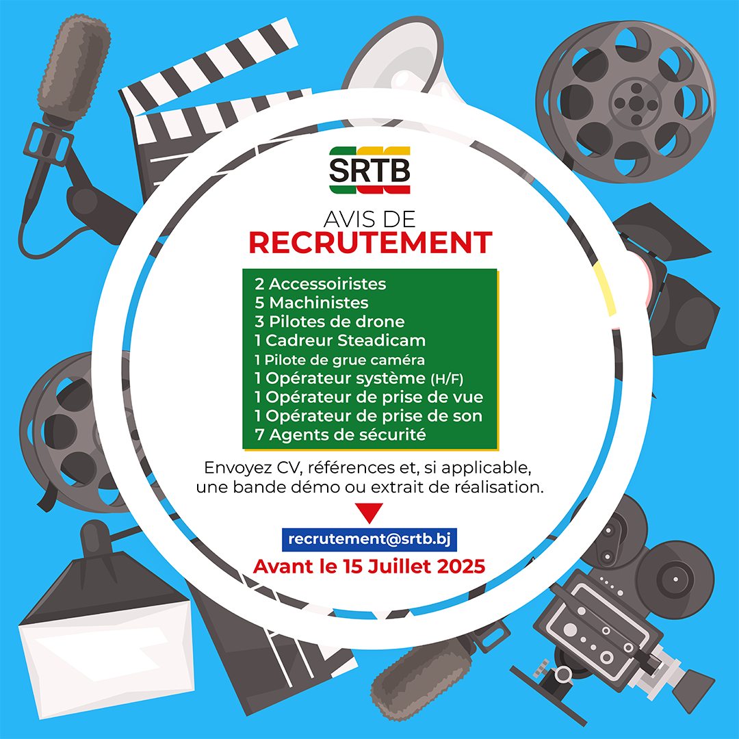 Envoyez votre CV, vos références et, si applicable, une bande démo ou extrait de réalisation à recrutement@srtb.bj avant le 15 juillet 2025.