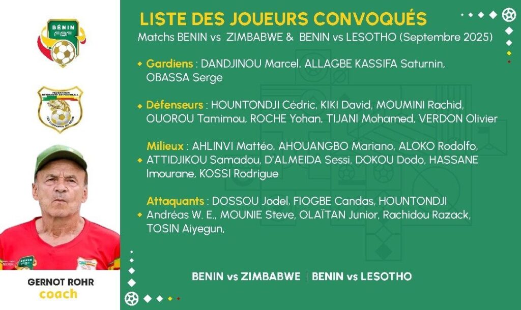 Le sélectionneur des Guépards était face aux hommes des médias ce jeudi 28 août 2025. A l’occasion, Gernot Rohr a dévoilé la liste des joueurs retenus pour les 7ᵉ et 8ᵉ journées des éliminatoires de la Coupe du Monde 2026 – Zone Afrique. Ci dessous la liste des 25 Guépards convoqués par le sélectionneur Gernot Rohr pour affronter le Zimbabwé et le Lesotho.