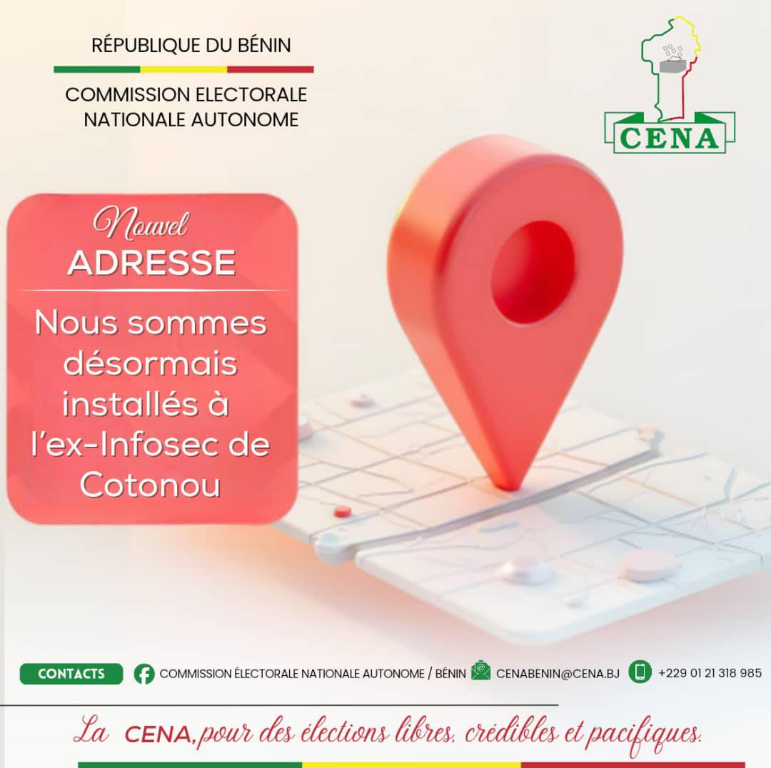 Le site qu’elle occupait jusqu’à présent étant concerné par les projets d’aménagement , la CENA s’installe désormais dans les locaux de l’ex-INFOSEC, à côté du Ministère des Affaires Étrangères et de la Coopération et de la Société de Radio Télévision du Bénin . Ce déménagement s’inscrit dans une dynamique de continuité et d’adaptation aux exigences d’un environnement administratif moderne.