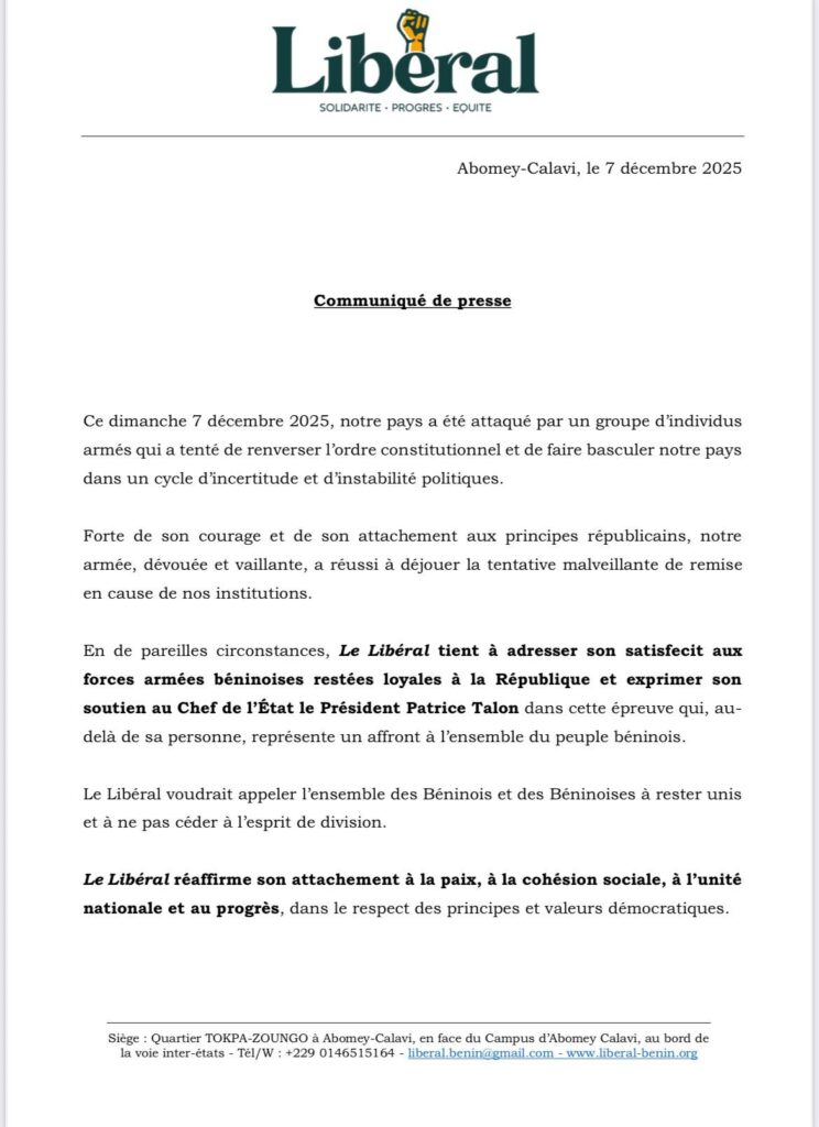 Coup d’état déjoué au Bénin : le parti Le Libéral salue la loyauté des FAB à la République