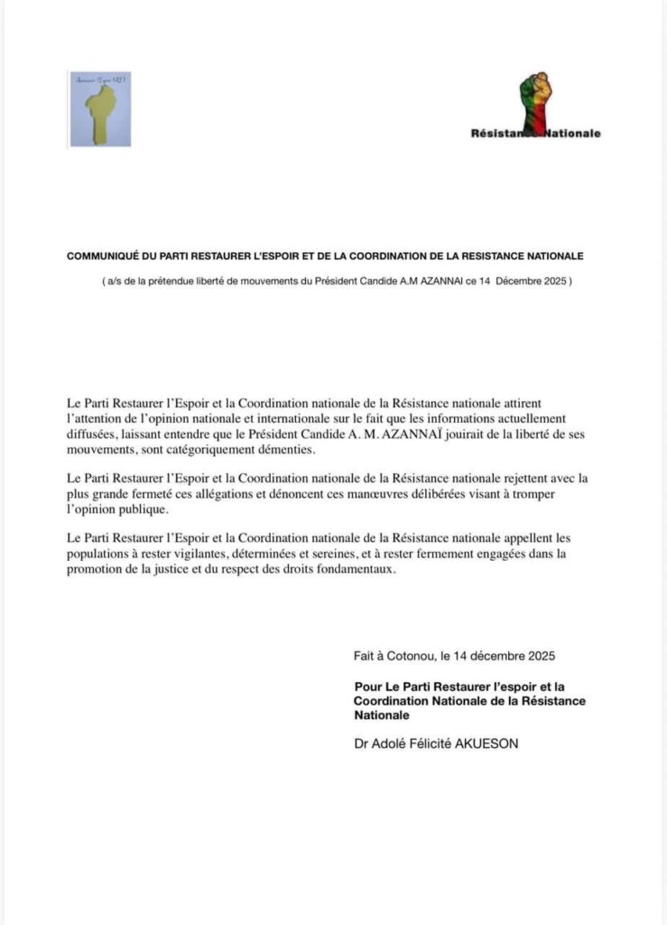 “Le parti Restaurer l’Espoir et la Coordination nationale de la Résistance nationale attirent l’attention de l’opinion nationale et internationale sur le fait que les informations actuellement diffusées, laissant entendre que le président Candide Armand Marie Azannaï jouirait de la liberté de ses mouvements, sont catégoriquement démenties”, peut-on lire dans le communiqué.