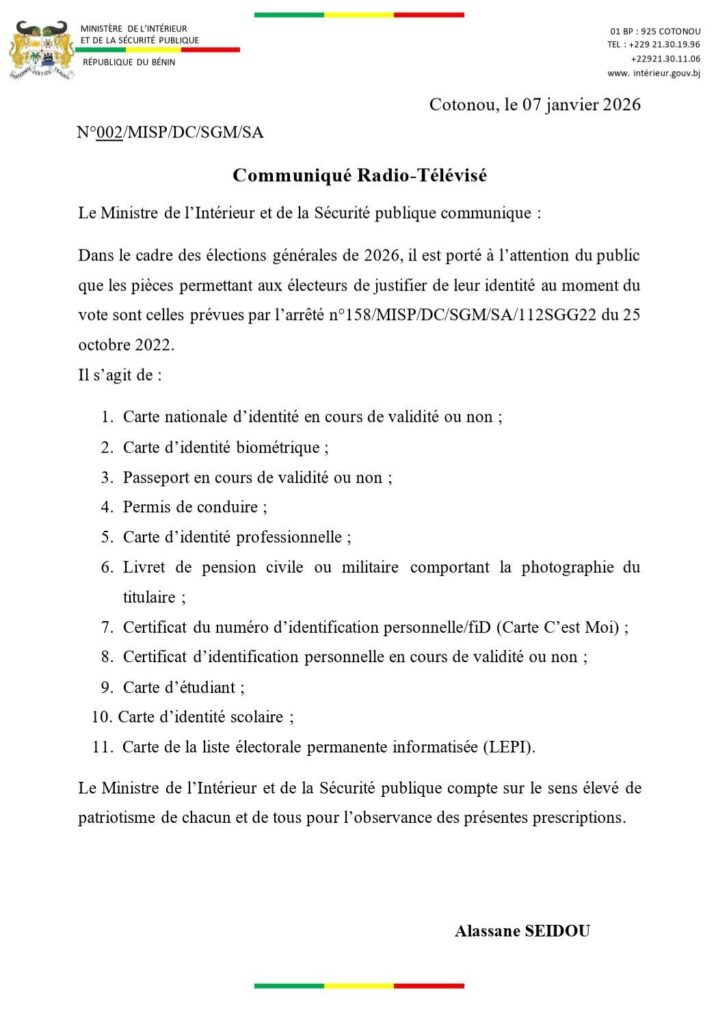 A quelques jours des élections couplées législatives et communales du 11 janvier 2026, le ministre de l’Intérieur Alassane Séidou rappelle aux électeurs les pièces permettant de voter. D’après le communiqué en date du mercredi 07 janvier 2026, il s’agit entre autres de : Carte nationale d’identité en cours de validité ou non, carte d’identité biométrique, permis de conduire, carte d’identité professionnelle, carte d’étudiant, carte d’identité scolaire, carte de la liste électorale permanente informatisée. Lire le communiqué ci-dessous pour découvrir les autres pièces concernées.