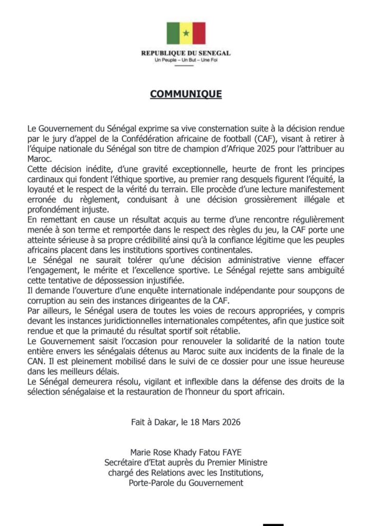 Le Gouvernement du Sénégal réagit à la décision du jury d’appel de la CAF d’attribuer la CAN 2025 au Maroc sur tapis vert. Rejetant la décision, les autorités sénégalaises annoncent qu’elles vont saisir les juridictions internationales compétentes afin que justice soit rendue et que la primauté du résultat sportif soit rendue. Communiqué :