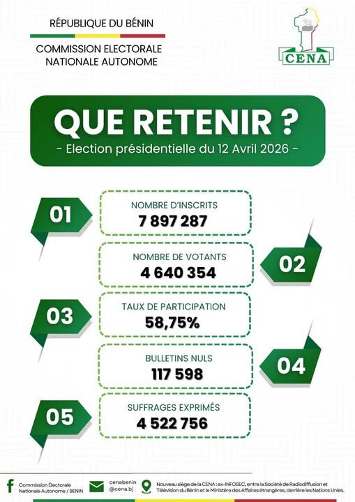 La Commission électorale nationale autonome (Céna) a proclamé tard dans la nuit du lundi 13 avril, les résultats de la présidentielle du 12 avril. D’après les chiffres publiés par l’organe en charge des élections au Bénin, le duo Romuald Wadagni/Mariam Chabi Talata s’impose largement avec 94,05%.