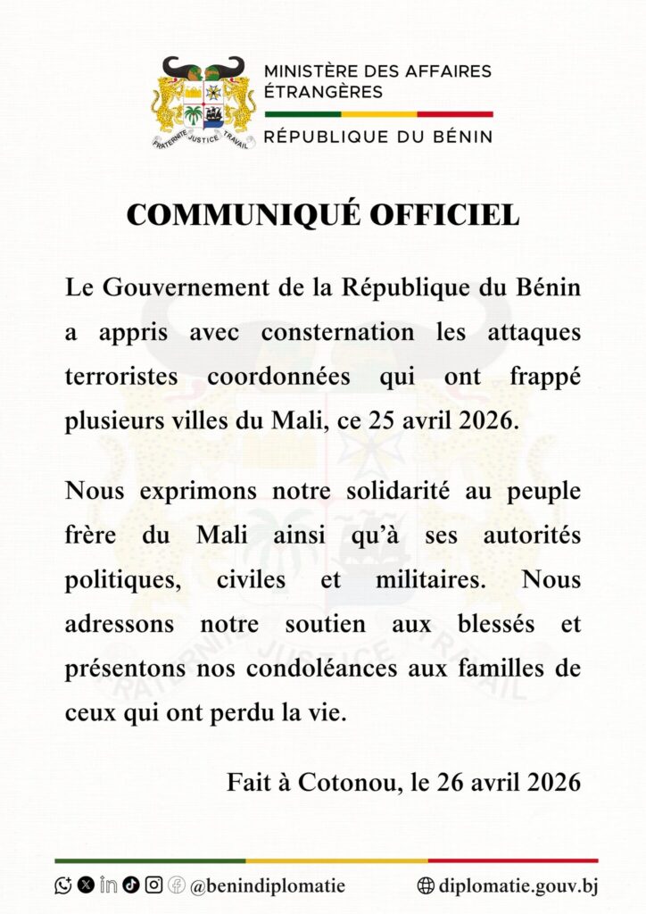 Le Front de libération de l’Azawad (FLA) et les djihadistes du JNIM ont lancé, samedi dernier, des attaques coordonnées contre plusieurs villes maliennes. Dans un communiqué publié ce dimanche 26 avril, le Gouvernement du Bénin a “exprimé sa solidarité au peuple frère du Mali ainsi qu’à ses autorités politiques civiles et militaires” suite à ces tristes avènements.
